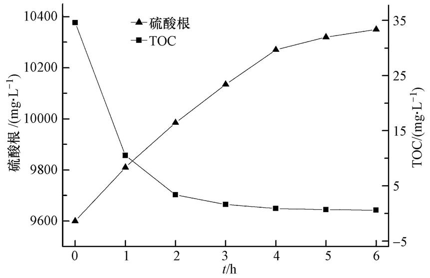 PS氧化反應過程中由于投加PS氧化廢水中的難降解有機物,反應過程中溶液的各組分發(fā)生了變化,主要包括無機和有機成分的變化.無機組分的變化主要是指ROC中的硫酸鈉隨著反應的持續(xù)進行濃度不斷升高.從圖 4可以看出,在投加1000 mg · L-1的PS條件下,6 h后出水硫酸根的濃度上升到10350 mg · L-1,出水回用于印染工藝,濃水中的高濃度硫酸鹽不僅沒有浪費,而且得到提升并作為染色助劑應用,減少染色工藝投加硫酸鈉10 g · L-1以上,硫酸鈉市場成本為0.68元· kg-1,節(jié)約成本6.8元· m-3.有機組分的變化主要是指ROC中的難降解有機物在PS作用下不斷礦化的過程.ROC中的TOC在4 h的反應時間內(nèi)降低到1.0 mg · L-1以下,表明經(jīng)PS氧化后廢水中的難降解有機物數(shù)量明顯減少,實現(xiàn)了難降解有機物的基本礦化.