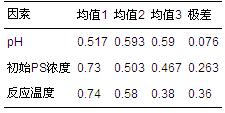 在單因素實驗基礎上利用正交試驗進行實驗優(yōu)化,采用3因素3位級正交試驗,正交試驗方案與試驗結(jié)果分析見表 1和表 2.由表 1和表 2可確定PS氧化反應中各因素對有機物去除率影響的強弱順序為:溫度>初始PS濃度>pH.其中,溫度的極差為0.36,高于其他因素,是影響有機物去除效果的主要因素.由此得到比較適宜的PS氧化條件為:pH為5.0,初始PS濃度為1000 mg · L-1,反應溫度為75 ℃.