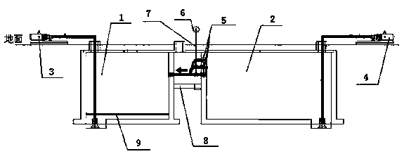 1.一種污水污泥濃縮池,包括污水池(1)和污泥池(2),其特征在于:所述污水池(1)和污泥池(2)之間設(shè)置有透明管段(8),所述污泥池(2)一側(cè)壁上端設(shè)置有多個(gè)閥門(5),所述閥門通過管線與污水池(1)連接,所述污水池(1)上方地面上設(shè)置有污水泵(3),所述污泥池(2)上方地面上設(shè)置有污泥泵(4)。