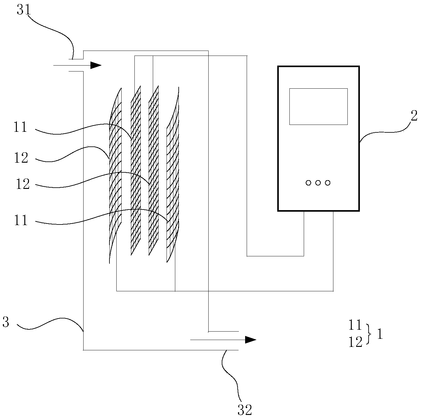 鈣鎂離子吸附自動(dòng)剝離器,包括容器、控制主機(jī)和至少一組電極組,所述容器上設(shè)有出水口和入水口,所述電極組位于所述容器內(nèi),所述電極組包括至少兩個(gè)電極,至少兩個(gè)電極被區(qū)分為類電極和第二類電極,所述控制主機(jī)至少用以向所述電極輸出高頻電信號(hào),且所述類電極與第二類電極分別連接至所述控制主機(jī)的不同的電極接口,從而分別實(shí)現(xiàn)正負(fù)兩種極性的電信號(hào)輸出,所述類電極與第二類電極的數(shù)量相等。