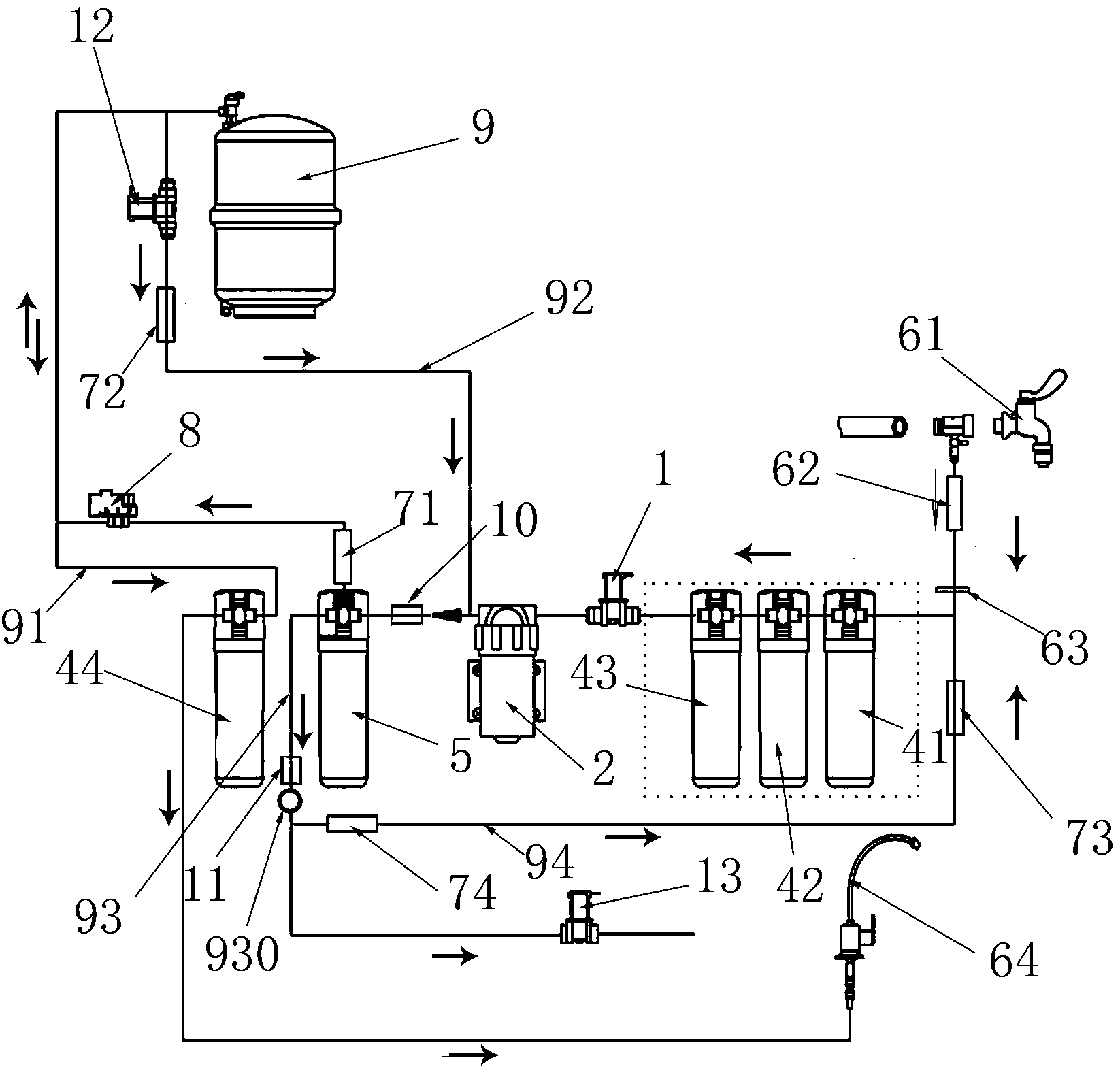進一步地,制水時,控制模塊控制進水電磁閥、增壓泵工作,濃水電磁閥關(guān)閉,原水經(jīng)由前置濾芯、進水電磁閥、增壓泵進入RO濾芯過濾后從純水出口排出。