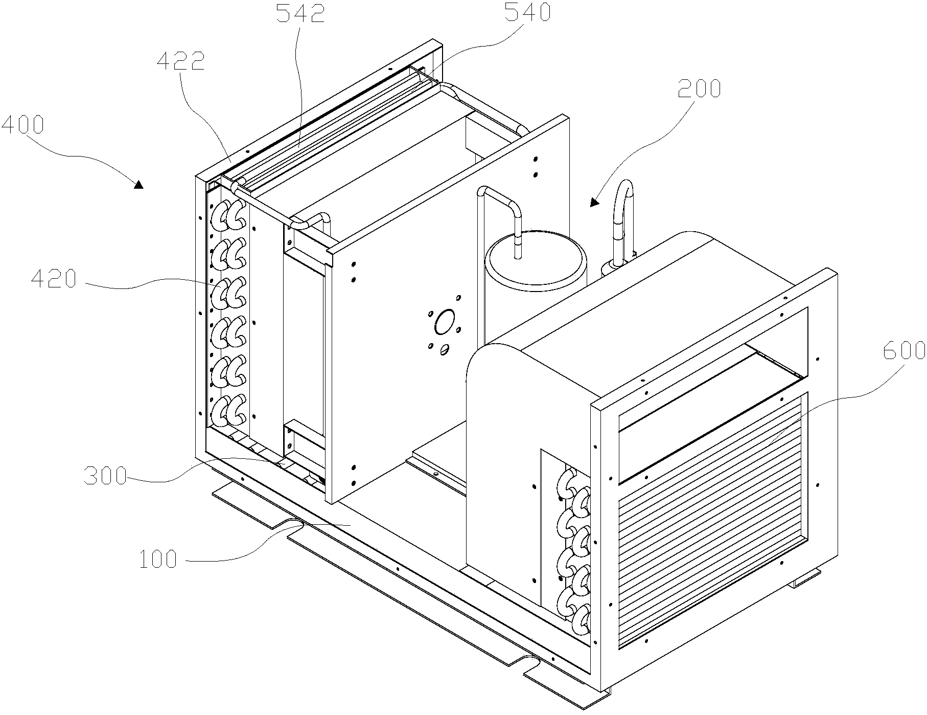 進(jìn)一步地,所述冷凝水蒸發(fā)裝置還包括與所述控制裝置電性連接的冷凝風(fēng)機(jī),所述蒸發(fā)組件還包括支架,所述支架設(shè)有進(jìn)風(fēng)口,所述冷凝風(fēng)機(jī)與所述進(jìn)風(fēng)口相對。
