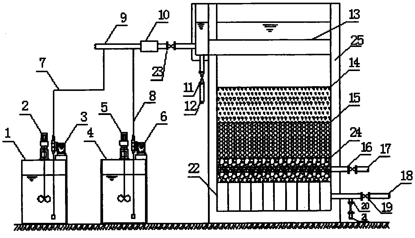 1.一種下向流零價(jià)鐵類芬頓-生物濾池集成化廢水處理設(shè)備,其特征在于,包括帶硫酸投藥泵(3)的硫酸溶藥池(1)、帶雙氧水投藥泵(6)的雙氧水溶藥池(4)及濾池(25),硫酸溶藥池(1)、雙氧水溶藥池(4)分別通過硫酸投藥管(7)、雙氧水投藥管(8)與廢水進(jìn)水管(9)連通,廢水進(jìn)水管(9)依次通過混合器(10)、廢水進(jìn)水調(diào)節(jié)閥(23)與濾池(25)頂部的進(jìn)水渠(13)的進(jìn)水口連接,反沖洗排水管(12)通過反沖洗排水調(diào)節(jié)閥(11)也與進(jìn)水渠(13)的進(jìn)水口連接;濾池(25)內(nèi)從上至下依次填充有鐵刨花濾層(14)、生物陶粒濾層(15)、承托層(24)、多孔濾磚(22),濾池(25)側(cè)壁位于承托層(24)處設(shè)有曝氣管(17),曝氣管(17)上設(shè)有曝氣管調(diào)節(jié)閥(16);濾池(25)側(cè)壁位于多孔濾磚(22)處設(shè)有出水管(18),出水管(18)上設(shè)有出水管調(diào)節(jié)閥(19),出水管調(diào)節(jié)閥(19)與濾池(25)側(cè)壁之間設(shè)有反沖洗進(jìn)水管(21),反沖洗進(jìn)水管(21)上設(shè)有反沖洗進(jìn)水管調(diào)節(jié)閥(20)。