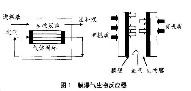 無泡曝氣生物反應器通過致密膜或者微孔膜向生物反應器進行無泡曙氣。氣體分壓低于泡點,并且氣體在膜系統(tǒng)中,提高了有機污水與膜的接觸時間,增加了傳氧效率。膜爆氣生物反應器見圖1。
