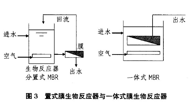 分置式膜生物反應器通過泵對其加壓,混合液在壓力的作用下進行過濾,這樣大分子有機物將被膜過濾出來,再回流到生物反應器中進行降解,如此循環(huán)操作進一步地對有機污水中的有機物進行分解。分置式膜生物反應器具有穩(wěn)定、容易操作、膜容易清洗等特征,是有機污水處理的有效方法之一,但是由于為了提高循環(huán)泵的壓力會消耗較高的動能。一體式膜生物反應器是將膜組件置于生物反應器中,再通過泵將過濾液抽出。分置式膜生物反應器與一體式膜生物反應器見圖3。