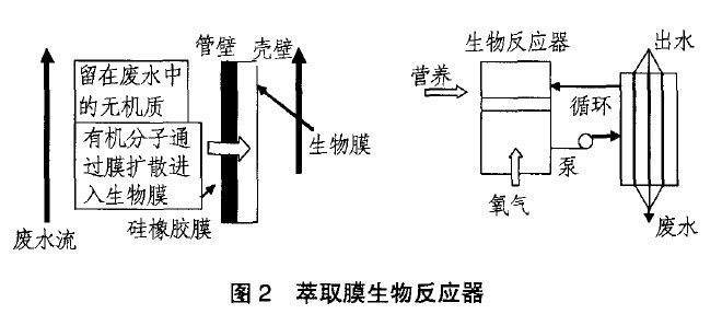 萃取膜生物反應器通過膜萃取與生物降解的方式對有機污水中難以溶解的有機物萃取出來,主要用于萃取有毒物質,再通過具有針對性的專性菌對其進行生物降解,從而對膜生物反應器進行優(yōu)化氣萃取膜生物反應器結構見圖2。