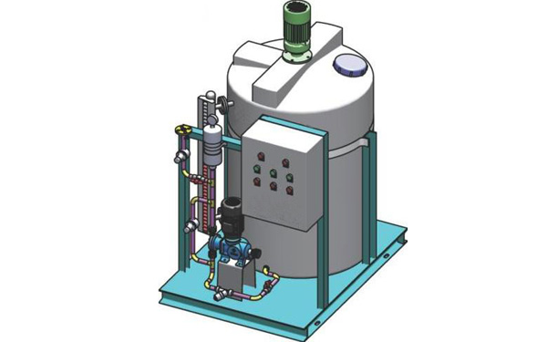 固體藥劑加入溶藥箱內(nèi)然后按比例加入工業(yè)水?dāng)嚢枞芙,由計量投加系統(tǒng)投加藥點。投加控制可