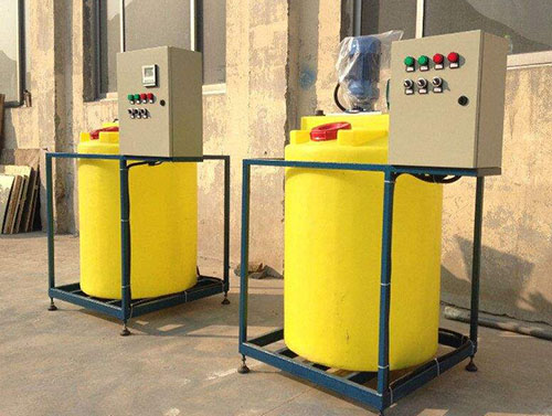 固體藥劑加入溶藥箱內(nèi)然后按比例加入工業(yè)水攪拌溶解,由計量投加系統(tǒng)投加藥點。投加控制可