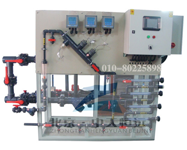 示蹤劑加藥裝置由示蹤劑儀表、PH儀表、0RP儀表、電導(dǎo)率儀表、控制系統(tǒng)、無線遠傳系統(tǒng)等部分組成。其工作原理是由示蹤劑儀表檢測循環(huán)水系統(tǒng)中藥劑的濃度,進行PID運算,然后自控制系統(tǒng)啟動或關(guān)閉加藥泵往循環(huán)水系統(tǒng)添加藥劑。其功能是使藥劑穩(wěn)定在一定的濃度范圍,達到保護管道不會結(jié)垢或腐蝕的趨勢。循環(huán)水系統(tǒng)進行排污或補水時,只要藥劑濃度滿足設(shè)定值,加藥泵依然不向系統(tǒng)中投加藥劑。從而節(jié)約客戶使用藥劑的成本。