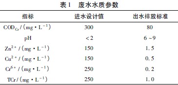 該工程的處理廢水為電鍍綜合廢水。改造工程的設(shè)計水量為500m3/d (其中含氰廢水100m3/d) ,水質(zhì)水量波動較大(水量日變化系數(shù)為3,進水COD 范圍100~300mg/L) 。具體參數(shù)見表1。