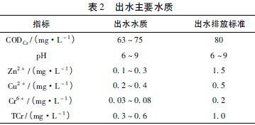 2012 年5 月份,該工程完成后,經(jīng)過一個星期聯(lián)動調(diào)試,完成整個系統(tǒng)調(diào)試運行,出水各項指標(biāo)達到《電鍍污染物排放標(biāo)準(zhǔn)》(GB21900-2008) 要求,并經(jīng)過3 個月的運行,效果良好。COD 去除率70%以上,六價鉻離子、鋅離子、銅離子去除率均在99%以上。處理出水達到處理效果見表2。