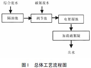 電鍍綜合廢水首先經(jīng)過隔油池隔油后進入調(diào)節(jié)池與破氰后的廢水混合調(diào)節(jié)pH 值3~4,泵入電絮凝池,利用高頻高壓脈沖電源在水中通電發(fā)生電化學(xué)反應(yīng),產(chǎn)生氧化、還原、絮凝和氣浮等四種效應(yīng),降解COD 和形成金屬氫氧化物,再進入加載磁絮凝池調(diào)整pH 到8. 5~9,加載磁粉加快泥水分離,上清液水質(zhì)達到出水排放標(biāo)準(zhǔn)。