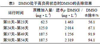 在正式期的第11天~第54天,持續(xù)的進水DMSO高負荷對模試裝置的運行形成沖擊,當DMSO處于高負荷狀態(tài)時DMSO的去除效果見表3。