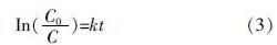 通過(guò)分析得知,杭錦土負(fù)載納米零價(jià)鐵對(duì)甲基橙的降解反應(yīng)屬于非均相反應(yīng),反應(yīng)過(guò)程可用一級(jí)反應(yīng)動(dòng)力學(xué)模型來(lái)描述[20]: