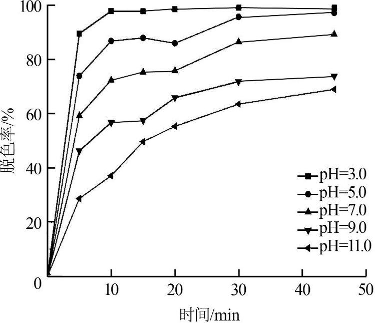 取200 mL質(zhì)量濃度為 50 mg/L的甲基橙溶液于500 mL燒杯中,在負(fù)載比為1∶3、投加量為3 g/L、25 ℃條件下,調(diào)節(jié)甲基橙溶液pH分別至3.0、5.0、7.0、9.0、11.0,考察初始pH對(duì)甲基橙溶液降解效果的影響,結(jié)果如圖4所示。