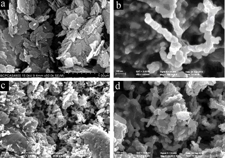 圖1(a)為天然杭錦土,其在掃描電鏡下呈棒狀、纖維狀、鱗片狀結(jié)構(gòu);圖1(b)為納米零價(jià)鐵,鐵球呈鏈狀聚集體;圖1(c)、(d)為負(fù)載型納米零價(jià)鐵,納米鐵球均勻分布在鱗片狀、棒狀、纖維狀結(jié)構(gòu)的杭錦土表面。SEM結(jié)果表明負(fù)載型納米零價(jià)鐵的鐵球均勻地分散在杭錦土表面,可減少納米零價(jià)鐵顆粒的聚集。