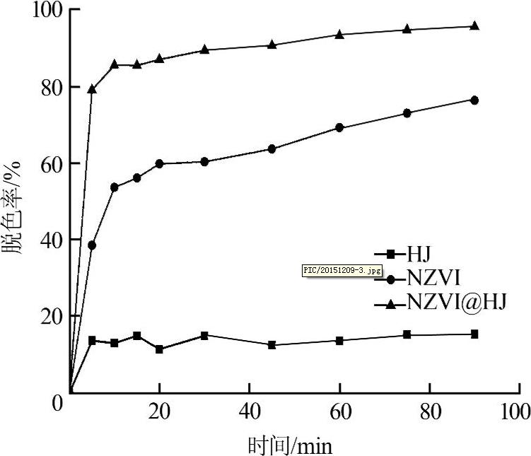 取200 mL質(zhì)量濃度為 50 mg/L甲基橙溶液置于500 mL燒杯中,分別將杭錦土(HJ)、納米零價(jià)鐵(NZVI)、負(fù)載質(zhì)量比為1∶1的負(fù)載型納米零價(jià)鐵(NZVI@HJ)加入甲基橙模擬溶液中,投加量分別為1.5、1.5、3 g/L,在初始pH為6.80、25 ℃條件下考察不同材料對(duì)甲基橙的降解情況,如圖3所示。