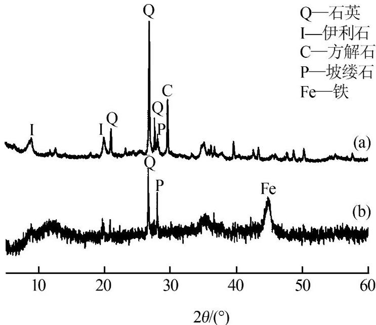 圖2(a)、(b)分別為杭錦土、杭錦土負(fù)載納米零價(jià)鐵的XRD譜圖。由圖2(a)可以看出杭錦土的主要礦物相為石英、伊利石、方解石、坡縷石,這些礦物相的檢出與掃描電鏡下觀察到的礦物相形態(tài)相符,證實(shí)了杭錦土中這4種礦物相的存在。由圖2(b)發(fā)現(xiàn)α-Fe特征衍射峰(2θ為44.8°)的出現(xiàn),表明Fe0顆粒成功負(fù)載到杭錦土上[8]。