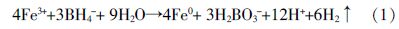 將磨碎的天然杭錦土在60 ℃鼓風(fēng)干燥箱內(nèi)烘干12 h,過(guò)0.074 mm(200目)篩后置于真空干燥器中備用。取2.0 g預(yù)處理的杭錦土置于三口燒瓶中,稱取9.66 g FeCl3·6H2O溶于50 mL乙醇溶液(40 mL無(wú)水乙醇、10 mL水)中,充分溶解后轉(zhuǎn)移至三口燒瓶中,在氮?dú)夥諊麓帕嚢?5 min。另稱取3.54 g NaBH4溶于100 mL水中后轉(zhuǎn)移至梨形分液漏斗中,在持續(xù)通入氮?dú)鈼l件下以每秒2~3滴的速度逐滴加入三口燒瓶混合液中,整個(gè)反應(yīng)過(guò)程中三口燒瓶中的溶液顏色由黃色變?yōu)榛疑笊珊谏z物質(zhì),表明生成了零價(jià)鐵。滴加完成后繼續(xù)在氮?dú)夥諊聰嚢?0 min以保證體系中的Fe3+被充分還原。反應(yīng)完成后,用無(wú)水乙醇將生成產(chǎn)物轉(zhuǎn)移至砂芯漏斗快速抽濾,抽濾過(guò)程中用無(wú)水乙醇洗滌3次以去除殘余的硼氫化鈉和氯化鈉等雜質(zhì),回收濾渣并將濕產(chǎn)品置于真空干燥箱于75 ℃隔夜(10~12 h)干燥即可得到負(fù)載型納米零價(jià)鐵材料。反應(yīng)式[7]為: