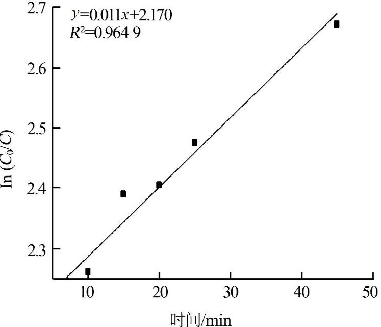 圖6顯示ln(C0 /C)與t呈現(xiàn)良好的線性相關(guān)性,R2=0.964 9,說(shuō)明負(fù)載型納米零價(jià)鐵對(duì)甲基橙的降解反應(yīng)遵循一級(jí)反應(yīng)動(dòng)力學(xué)規(guī)律。