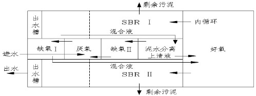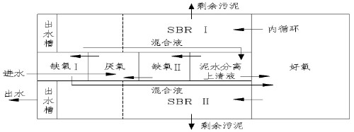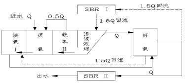 運行過程中,污水首先進(jìn)入?yún)捬醭,與來自泥水分離池、并經(jīng)缺氧池Ⅱ反硝化后的混合液混合,使聚磷菌在此充分釋磷,然后進(jìn)入缺氧池Ⅰ繼續(xù)進(jìn)行反硝化。反硝化后的混合液進(jìn)入好氧池,完成有機物去除、硝化和聚磷菌的攝磷等功能,比較后混合液進(jìn)入SBR 池Ⅰ或SBR 池Ⅱ,在此進(jìn)行比較后的處理及泥水分離,并排出澄清出水(如圖2 所示) 。除兩個SBR 池外,工藝中其余各池均處于恒水位、連續(xù)運行的狀態(tài),其運行操作方式基本固定。而對SBR 池而言,當(dāng)其中一個SBR 池作為比較后處理工段時,另一個SBR 池則在1.5Q 的回流量(至泥水分離池) 的條件下以硝化、反硝化的模式運行或進(jìn)行靜止預(yù)沉淀。運行期間始終進(jìn)行污泥回流,并首先進(jìn)入泥水分離池分離濃縮,上清液進(jìn)入好氧池,濃縮污泥進(jìn)入缺氧池Ⅱ,進(jìn)行反硝化,并消耗掉污泥中DO 和硝酸鹽,為隨后在厭氧池中的釋磷過程創(chuàng)造有利條件。