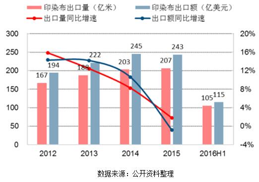 2012-2016年H1印染布出口情況及同比增速