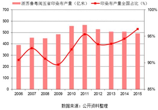 區(qū)域集中度高是印染行業(yè)的顯著特點(diǎn),浙江、江蘇、山東、廣東和福建是我國印染五大主生產(chǎn)區(qū)。2006 年五大省份印染布年產(chǎn)量近 390 億米,占全國印染布總產(chǎn)量比例突破 90%。此后五省產(chǎn)量占比保持在 90%以上,且呈逐漸上升趨勢。2015 年五大省印染布產(chǎn)量 491 億米,占全國產(chǎn)量的 96.4%,地域集中度極高。