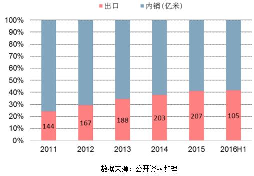 出口業(yè)務(wù)在我國印染行業(yè)中占重要地位。2011-2016 年,印染布出口占比逐年增加,2015 年達(dá)到 41.3%,2016年上半年繼續(xù)保持升高態(tài)勢。數(shù)量方面,2012-2015 年出口量年均增速為 7.4%,2015 年出口 206.6 億米,2016年上半年為 105.4 億米,出口量增加和印染布價(jià)格的提高從兩側(cè)發(fā)力拉動(dòng)出口額增長。三年間出口額(以美元計(jì))年均增速為 7.8%,2015 年實(shí)現(xiàn)出口額 243.1 億美元。如果人民幣在 2017 年繼續(xù)貶值,將對出口占比逐年升高的印染企業(yè)形成利好效應(yīng),從而進(jìn)一步改善我國印染行業(yè)的供需格局。