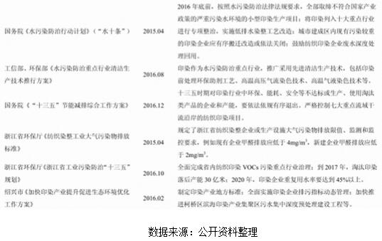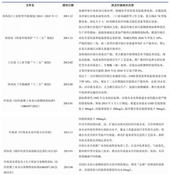 近年來各級政府涉及印染行業(yè)環(huán)保政策相繼出臺(tái)