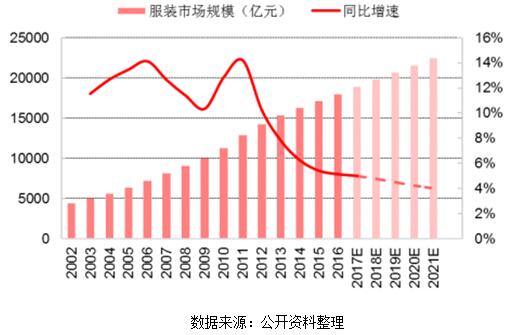 內(nèi)需方面,隨著消費(fèi)升級程度加深和人均可支配收入水平的提高,我國服裝市場規(guī)模穩(wěn)定增長。據(jù)統(tǒng)計(jì),2016 年我國服裝市場規(guī)模達(dá) 17976 億元,同比增長 5.1%,且未來五年將以 4.4%的年均增速平穩(wěn)擴(kuò)張,至 2021 年實(shí)現(xiàn)銷售額 22394 億元人民幣。
