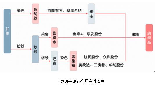 印染在紡織服裝產(chǎn)業(yè)鏈中作為中間環(huán)節(jié)為下游服裝制造企業(yè)提供面輔料。面料著色領(lǐng)域目前共三種生產(chǎn)方式,分別為印染布、色織布和色紡紗。其中色織布和色紡紗因適用范圍小、銷售單價(jià)高尚未形成較大規(guī)模。該領(lǐng)域仍以印染布為主要的染色形式,約占全球著色面料的 80%。
