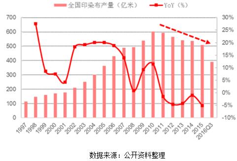我國印染布產(chǎn)量自 2011年以來逐年下降