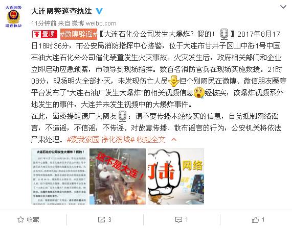 事故發(fā)生之后,網(wǎng)上流傳的許多視頻不實,有人以為是發(fā)生大爆炸,但大連警巡查執(zhí)法微博公告稱,此事故并未發(fā)生大爆炸事件。