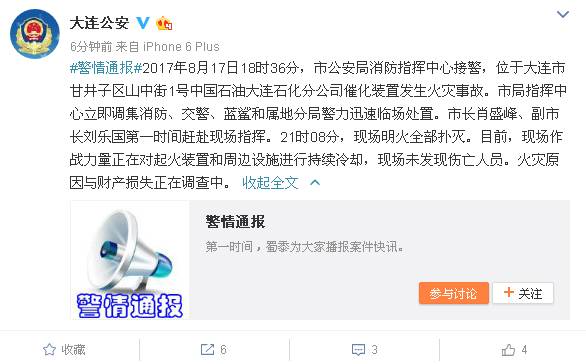 昨晚21:54,大連公安發(fā)布警情通報,證實中石油大連分公司發(fā)生火災事故。
