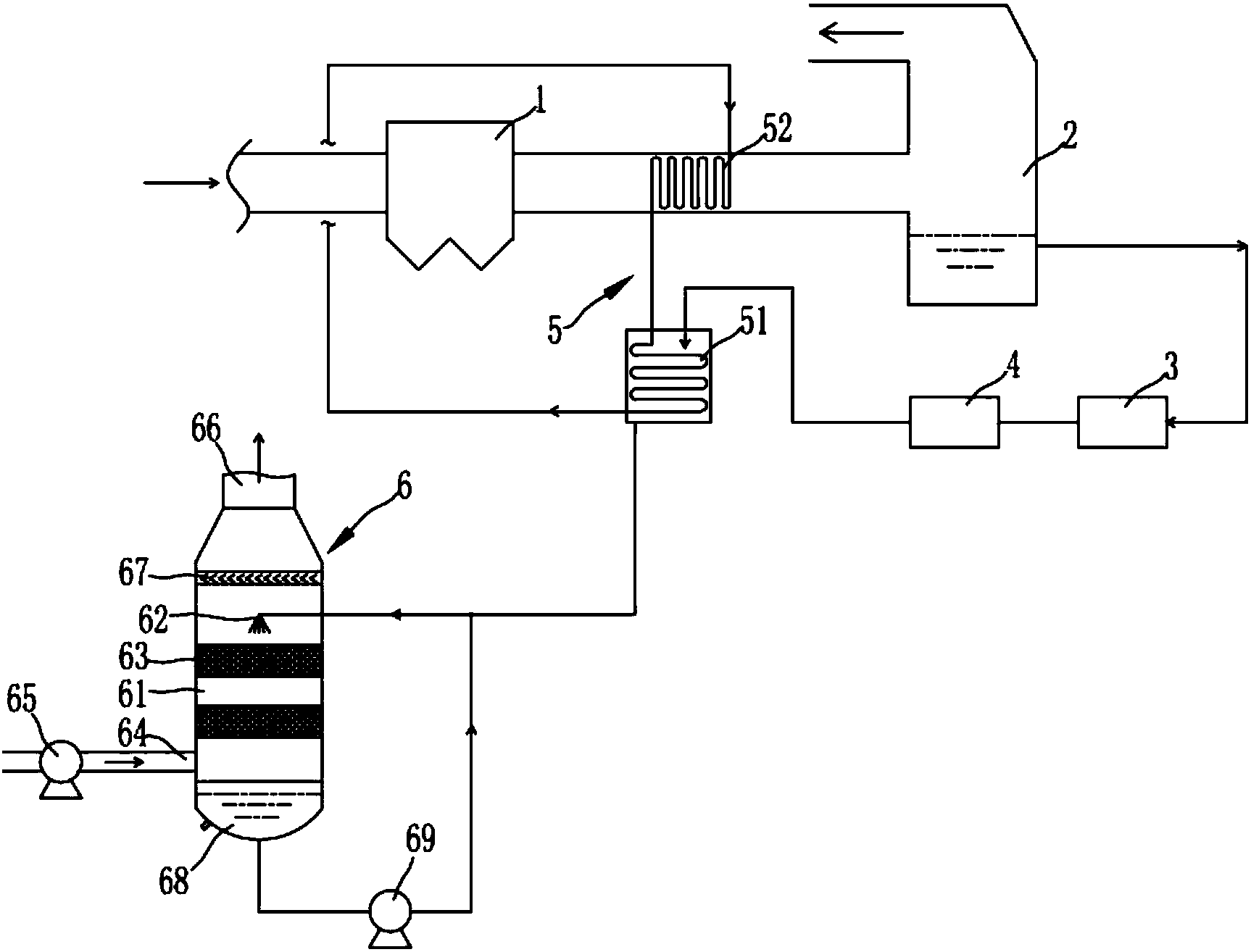 廢水預(yù)熱裝置(5),利用除塵器(1)與脫硫吸收塔(2)之間煙道內(nèi)的煙氣熱量對(duì)預(yù)處理后的廢水進(jìn)行預(yù)熱;