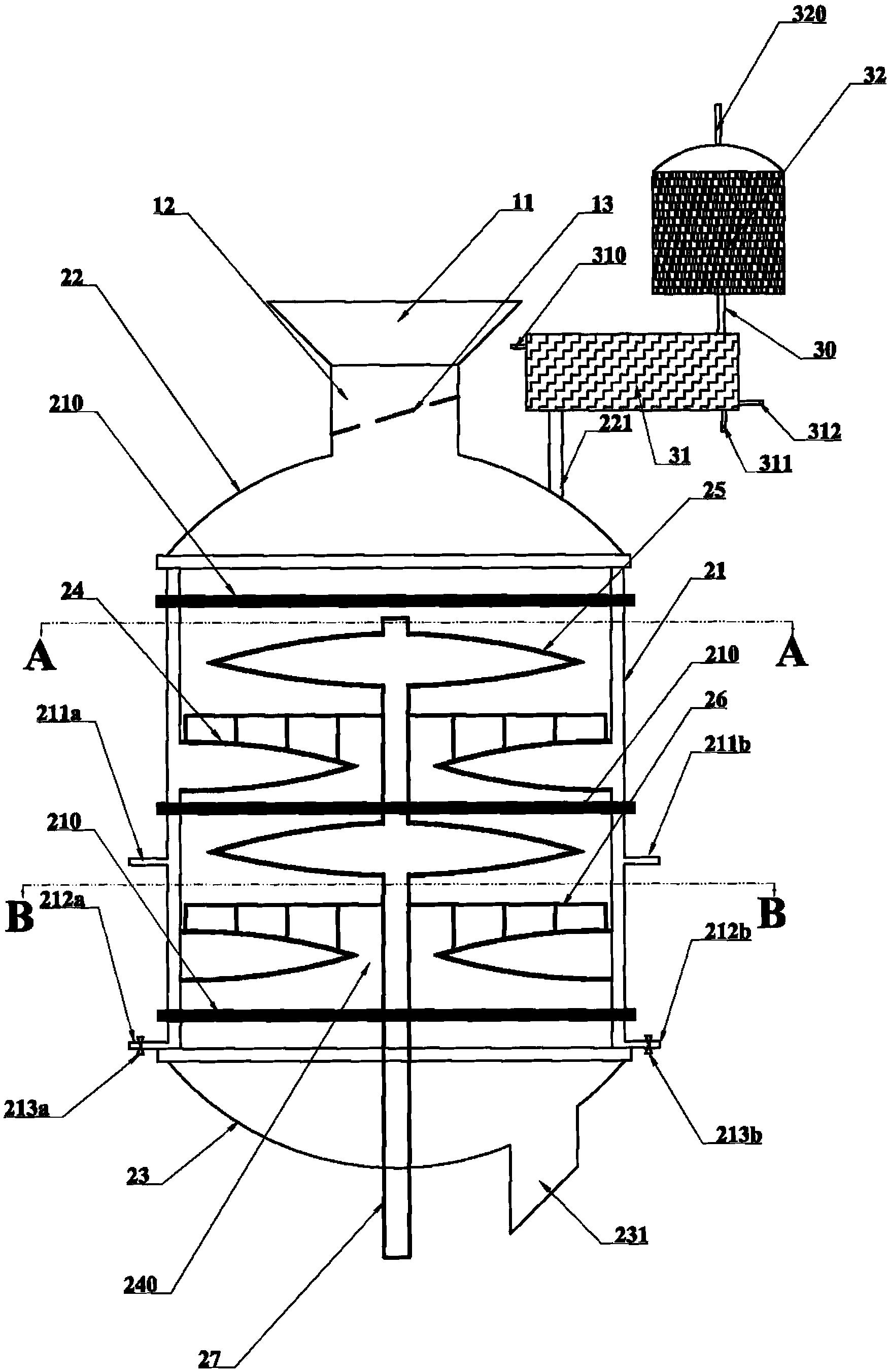 本實用新型通過以下技術方案來實現(xiàn)上述目的:一種用于污泥焚燒發(fā)電的干化預處理裝置,包括進料系統(tǒng)1、污泥干化筒2、空氣凈化系統(tǒng)3。所述的進料系統(tǒng)1由進泥口11、儲泥倉12組成。所述的污泥干化筒2由筒體21、上封頭22、下封頭23組成,所述的污泥干化筒中安裝有定盤24、動盤25、鈀齒26、旋轉軸27。所述的空氣凈化系統(tǒng)由冷凝器31和活性炭吸附柜32組成。所述的儲泥倉12上部設有所述的進泥口11,所述的儲泥倉12中設有振動篩13;所述的筒體21側壁設有蒸汽入口211a、第二蒸汽入口211b和冷凝水出管212a、第二冷凝水出管212b,所述的筒體21上中下均設有帶式管箍210;所述的上封頭22上以法蘭密封安裝有排氣管221;所述的儲泥倉12通過法蘭密封連接于所述的上封頭22的中心;所述的下封頭23底部中心設有出料口231;所述的上封頭22、下封頭23均以法蘭密封連接于筒體21上;所述的定盤24中心預留有卸料孔240;所述的冷凝水出管212a、第二冷凝水出管212b上設有電磁閥213a、第二電磁閥213b;所述的排氣管221通過螺紋連接于冷凝器31,冷凝器31通過管道30與活性炭吸附柜32連通,活性炭吸附柜32上設有放空管320,冷凝器31上設有冷凝水進水口310、冷凝水出水口311和冷凝水循環(huán)管312。