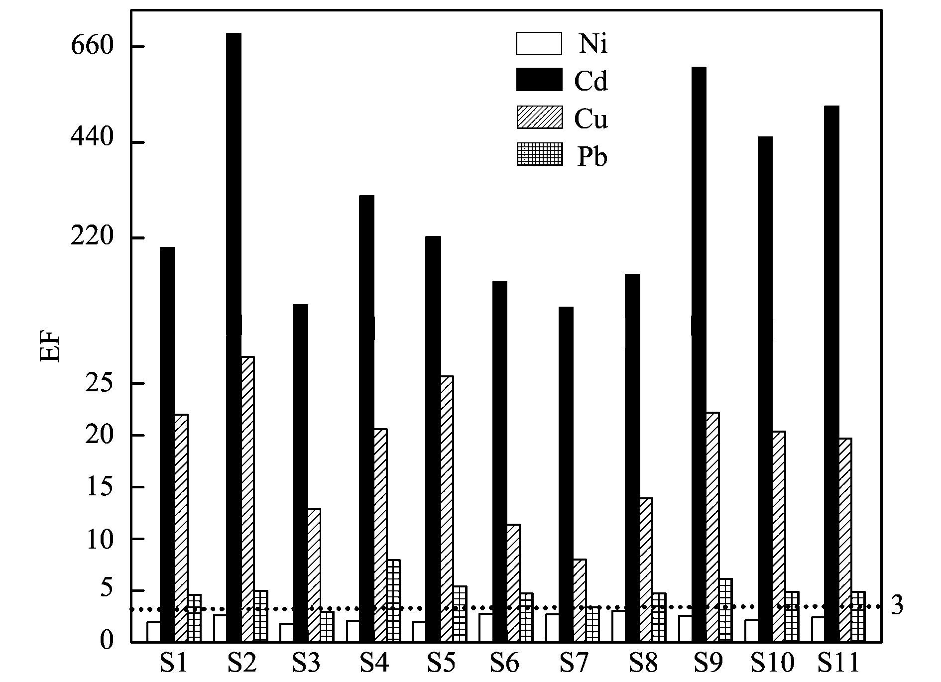 采用重金屬實測值與工業(yè)化以前長江系沉積物中重金屬的平均含量的比值即富集系數(shù)(EF)來判斷沉積物中重金屬元素的富集程度及人為影響狀況.各采樣點重金屬的富集系數(shù)如圖 3所示.沉積物中各重金屬富集系數(shù)大小順序為Cd(308.51)>Cu(18.58)>Pb(4.97)>Ni(2.38).已有研究指出, 若EF大于3, 屬于嚴(yán)重污染等級.除所有采樣點中Ni的EF值小于3和S3點位中Pb的EF值(2.94) 接近3外, 各采樣點沉積物中重金屬的EF值均大于3, 存在重度富集現(xiàn)象; 尤其是Cd累積比較為典型, 其EF值介于60.88~688.76, 在研究區(qū)沉積物中的含量變化范圍為15.22~172.19 mg·kg-1, 是比較主要的污染貢獻(xiàn)元素, 表明大冶湖沉積物Cd重度污染除受大冶湖流域內(nèi)過度施用農(nóng)藥和化肥等農(nóng)業(yè)活動輸入影響外, 很大程度上受有色金屬冶煉、化肥使用及礦山開采等活動廢水排放的影響.
