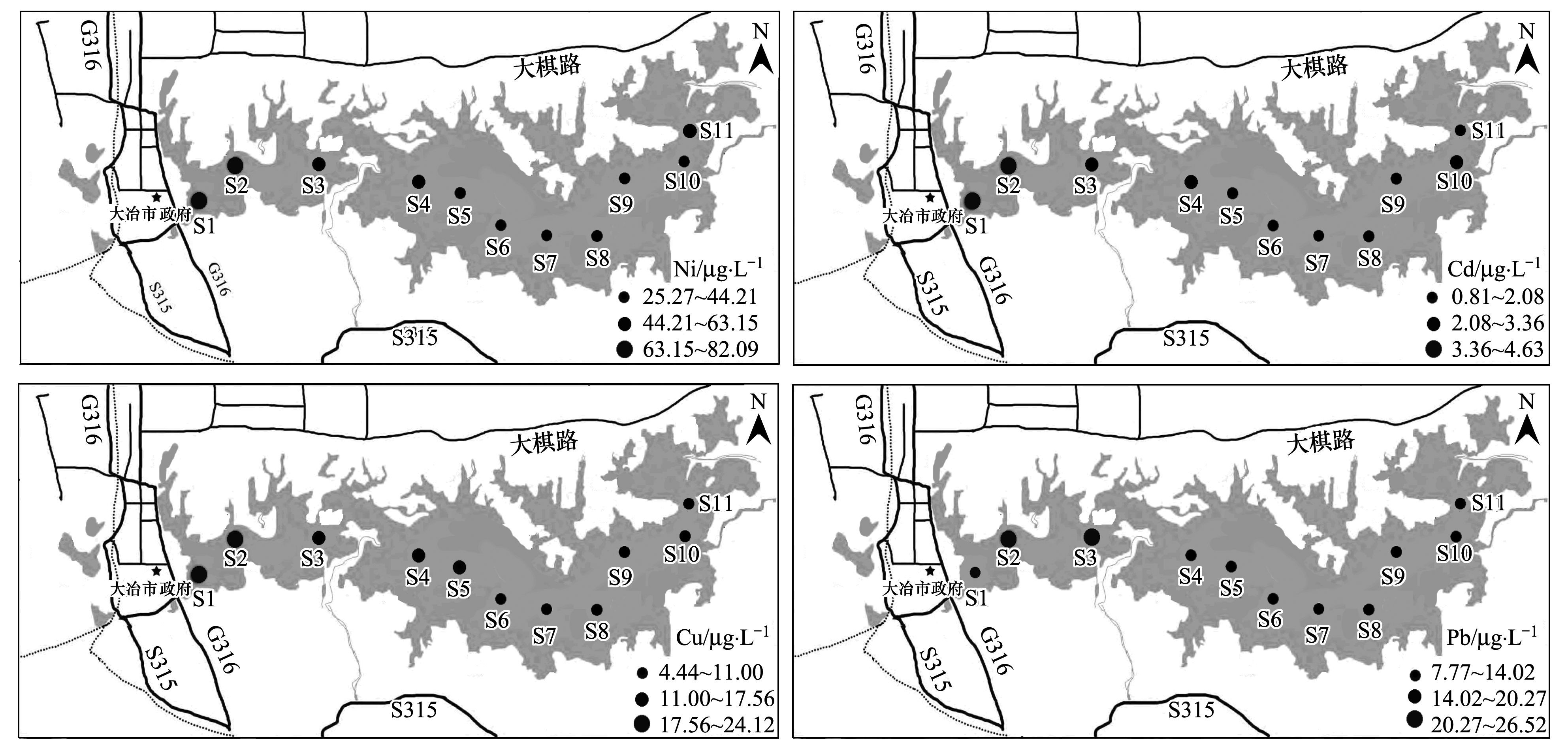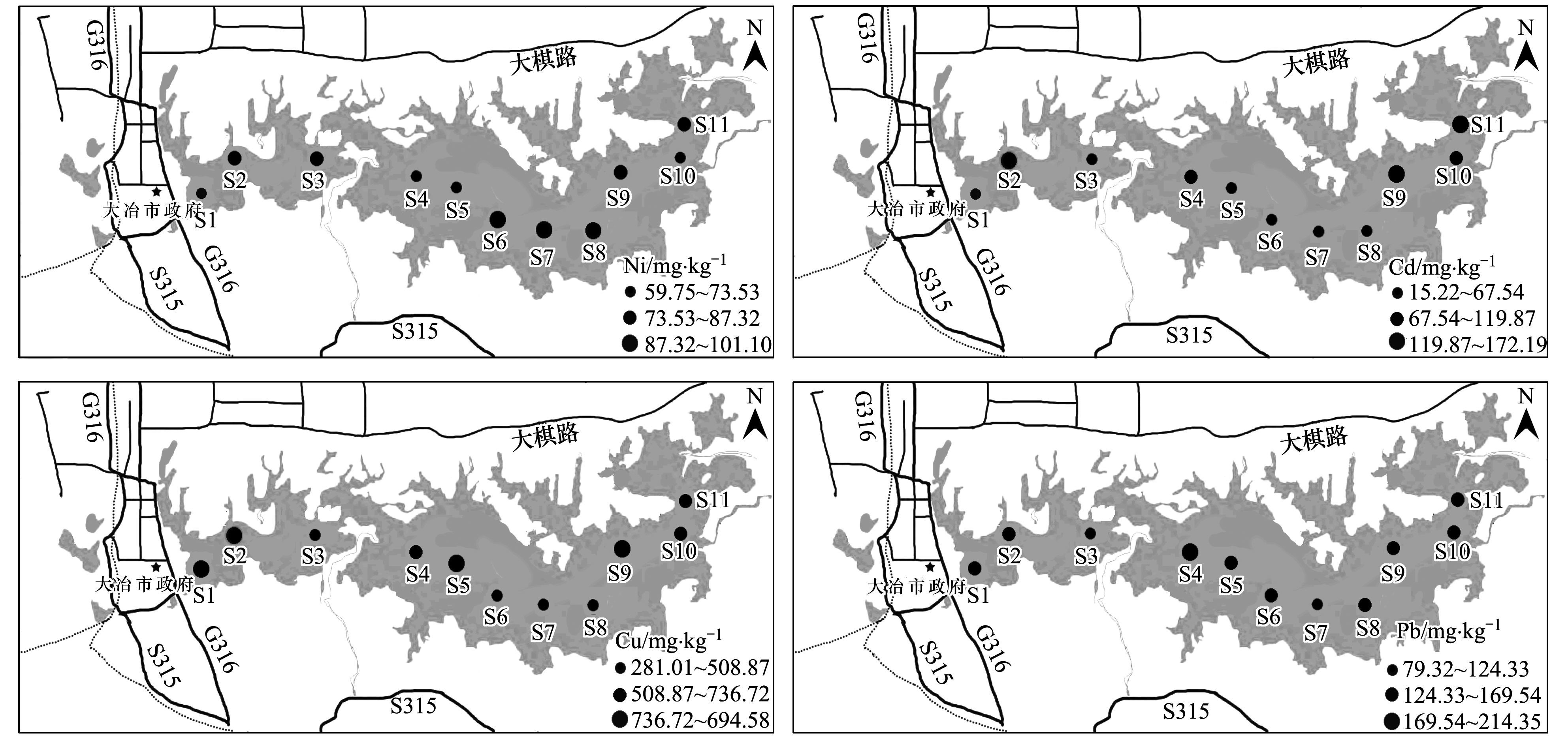重金屬(Ni、Cd、Pb和Cu)元素污染分布特征表現(xiàn)為:大冶湖表層水和沉積物中重金屬元素污染主要分布在市政污水和工業(yè)廢水排污口較集中的湖灣區(qū)域, 而中部重金屬污染總體趨勢一致; 究其原因, 大冶湖湖灣(S1、S2和S11) 周邊分散著多家大型國有高污染礦冶企業(yè)以及大量“五小”(小選礦、小洗礦、小冶煉、小紅磚、小化工)企業(yè).此外, 大冶湖流域植被覆蓋率低, 山體裸露, 地質(zhì)災(zāi)害時有發(fā)生, 水域面積不斷縮小, 人口數(shù)量不斷增加, 同樣也會直接導(dǎo)致大冶湖湖灣處重金屬污染更為嚴(yán)重.由于大冶湖是半封閉的水體, 流動性及與其他水體交換能力低; 大量重金屬污染物主要以懸浮物的形式, 通過各種途徑進(jìn)入湖泊水體后, 隨著水流的搬運(yùn)以及重力沉降作用, 比較終遷移至湖泊沉積物中, 導(dǎo)致大冶湖中部水體重金屬分布較均勻.