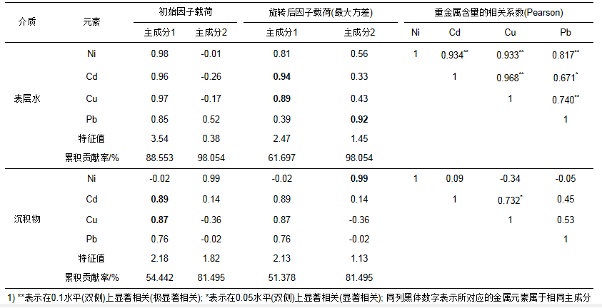 本研究使用SPSS 22.0統(tǒng)計分析軟件對大冶湖表層水和沉積物中重金屬元素(Ni、Cd、Cu和Pb)含量進(jìn)行Pearson相關(guān)系數(shù)、主成分及其成分矩陣等多元統(tǒng)計分析, 結(jié)果如表 2所示.
