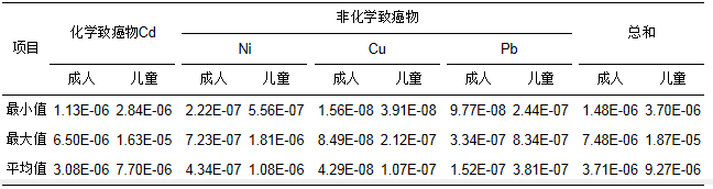 基于水環(huán)境健康風(fēng)險評價模型及參數(shù), 計算出大冶湖水體中化學(xué)致癌物(Cd)和非致癌物(Ni、Cu和Pb)通過飲用途徑所致的個人年健康風(fēng)險, 結(jié)果見表 3.