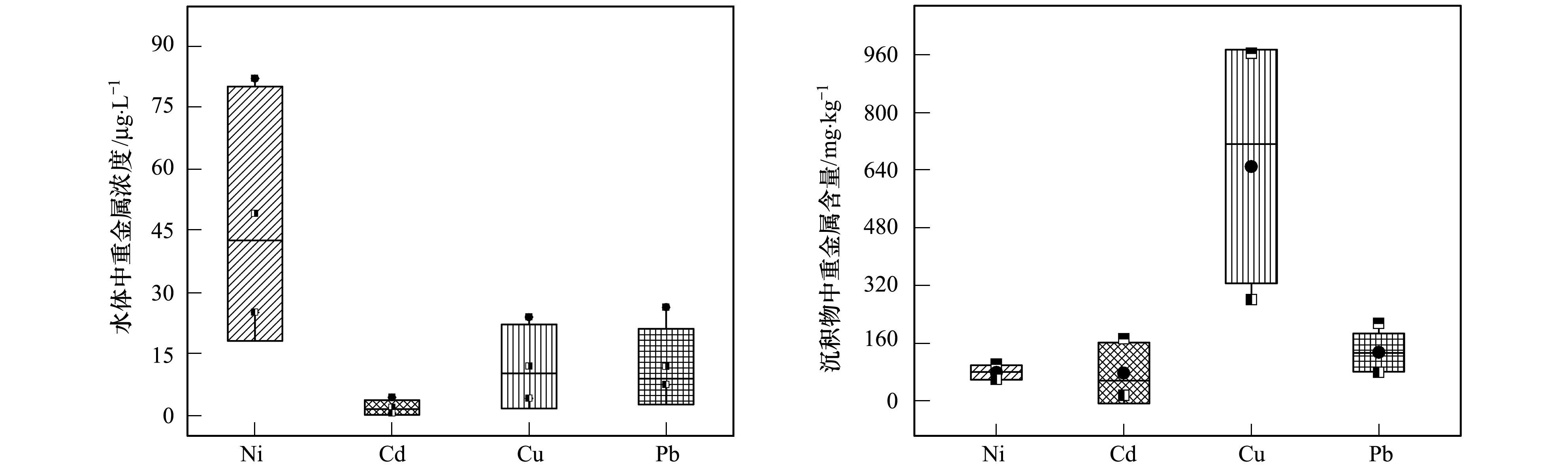 水樣帶回實驗室后, 通過“王水+雙氧水”加熱濃縮, 經(jīng)過濾并測其重金屬含量.沉積物樣品置于通風(fēng)處自然風(fēng)干后, 經(jīng)碾碎、剔除雜質(zhì)、研磨、篩分等前期處理操作, 用傳統(tǒng)的封閉式混合酸(HCl-HNO3-HF-HClO4)法高溫消解后, 使用火焰原子吸收分光光度計(美國Varian AA240) 測定樣品中重金屬污染元素Ni、Cd、Cu和Pb.在實驗過程中供試試劑均為優(yōu)級純, 所用器皿均用王水浸泡24 h以上.同時, 質(zhì)量保證采用三平行樣和加標(biāo)回收法; 其中, 樣品分析數(shù)據(jù)的標(biāo)準(zhǔn)偏差(RSD)均在10%以內(nèi); 對國家土壤成分分析標(biāo)準(zhǔn)物質(zhì)(GSS-3、GSS-5) 進(jìn)行回收率分析時, 各元素回收率在86%~115%之間.所有數(shù)據(jù)均基于Excel 2013、SPSS 22.0和Origin 9.0等軟件進(jìn)行統(tǒng)計分析.