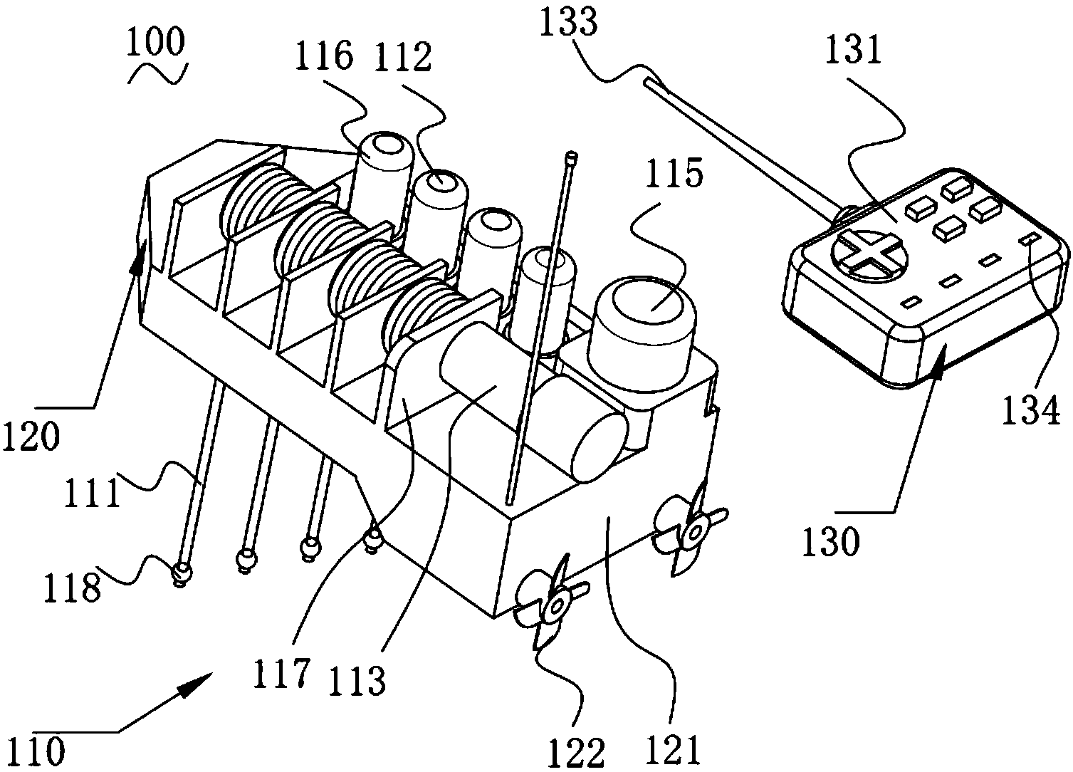 8、控制組件還包括嵌設(shè)于遙控器上用于指示采樣進(jìn)程的若干個報警器和若干個提示燈,所述報警器和提示燈的數(shù)目與試管的數(shù)目相匹配,通過報警器和提示燈,指示采用進(jìn)程,如當(dāng)采樣完成時,報警器發(fā)出警報,提示燈閃亮,工作人員收到信號后停止采樣,進(jìn)一步增加了本實(shí)用新型使用的便利性。