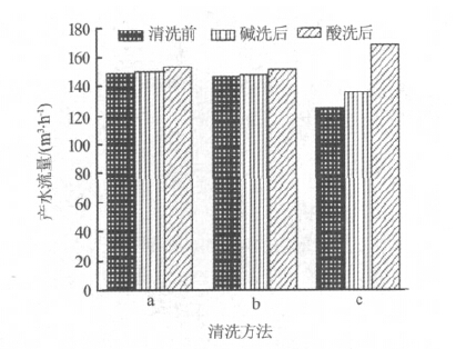 超濾系統(tǒng)清洗前后產(chǎn)水流量的變化見圖3。