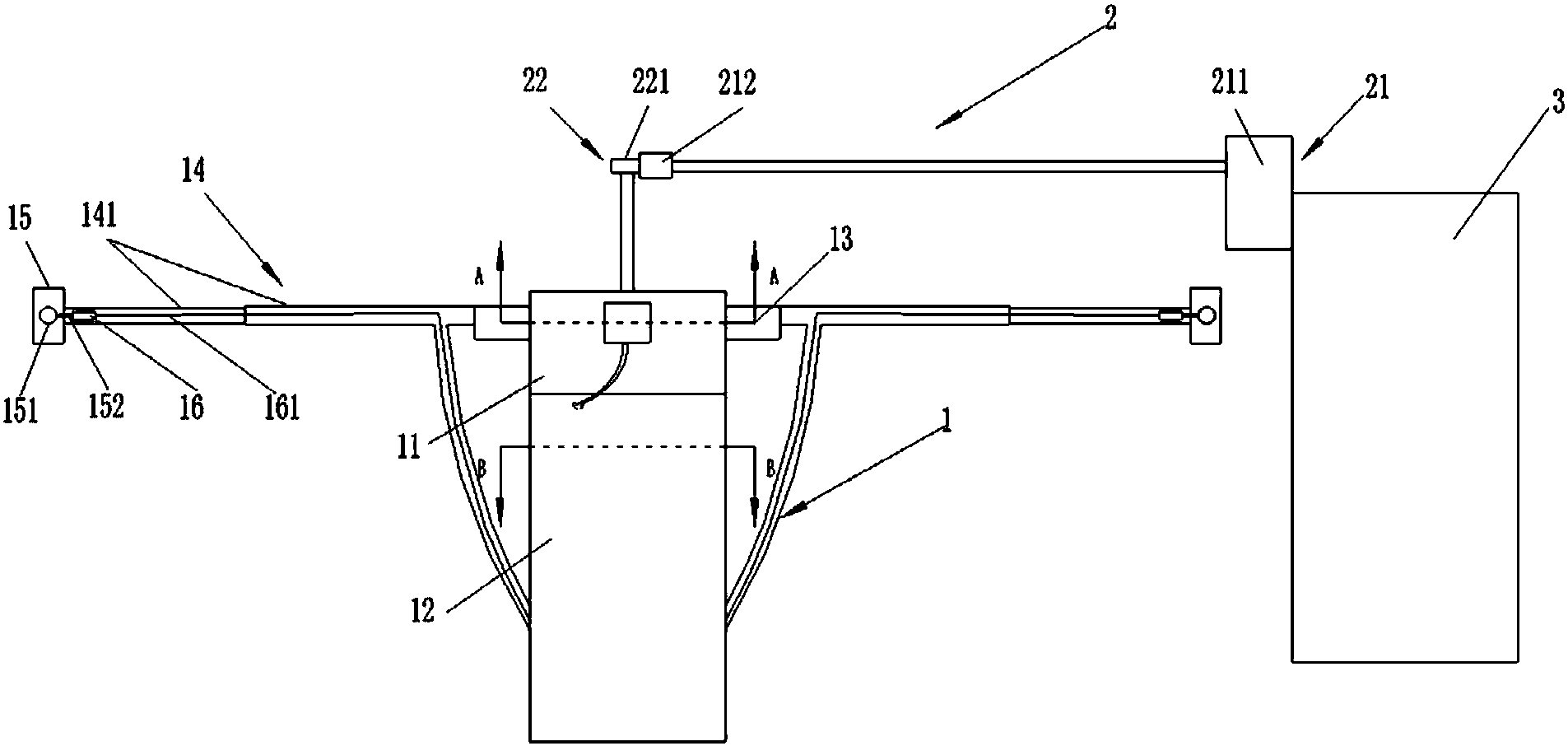 4.根據(jù)權(quán)利要求1所述的污水回收處理裝置,其特征在于:所述伸縮桿(14)包括多節(jié)依次套設(shè)的空心桿(141);比較外節(jié)空心桿(141)兩端密封。