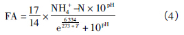 pH 會(huì)影響微生物的生存條件,同時(shí)也會(huì)影響氨在廢水中的存在形態(tài),AOB 適宜pH 值在7.0~8.5。Anthonisen 等研究表明,F(xiàn)A 對AOB 和NOB 都有抑制作用,對AOB 的抑制濃度為10~150 mg /L,對NOB 的抑制濃度為0.1~1.0 mg /L。本實(shí)驗(yàn)控制溫度為(30 ± 1) ℃,進(jìn)水氨氮濃度為10.69~320.79mg /L,調(diào)節(jié)進(jìn)水pH 值為8.0 左右,DO 為4.0~5.5mg /L,按照溶液中FA 的濃度計(jì)算公式(4) 計(jì)算,進(jìn)水初始FA 濃度為1~30 mg /L。