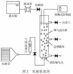本實(shí)驗(yàn)所用的曝氣流化床反應(yīng)器如圖2 所示。玻璃柱體有效容積約為1.5 L,內(nèi)徑8 cm,高40cm。反應(yīng)器內(nèi)包埋載體填充率為15%,采用間歇式進(jìn)水,實(shí)驗(yàn)?zāi)M廢水根據(jù)現(xiàn)場合成氨工業(yè)廢水濃度進(jìn)行配置,以氯化銨為氨源,投加NaHCO3維持堿度,pH 維持在8.0 左右,不同初始游離氨、有機(jī)物濃度廢水根據(jù)實(shí)驗(yàn)所需另行配置。溫度通過加熱棒進(jìn)行調(diào)節(jié),利用電磁式空氣泵進(jìn)行微孔曝氣,用氣體流量計(jì)來控制曝氣量,反應(yīng)器每隔12 h 進(jìn)出水,出水檢測NH4+-N、NO2--N、NO3--N 濃度。