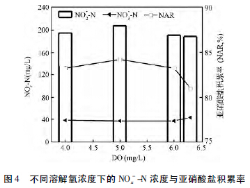 在低DO 下,AOB 的增殖速率加快,補(bǔ)償了由于低DO 所造成的代謝活動(dòng)下降,同時(shí)AOB 對DO 的親和力強(qiáng)于NOB,使得NH4+ →NO2-的過程未受到明顯影響,而NOB 氧化NO2-的能力卻大大減弱,從而造成系統(tǒng)中亞硝態(tài)氮的積累。本實(shí)驗(yàn)采用包埋固定微生物技術(shù),氧氣和底物需通過載體內(nèi)的微孔進(jìn)行傳遞,導(dǎo)致氧利用率降低,較污泥體系所需DO 質(zhì)量濃度要大。圖4 中,將DO 分別控制在4、5、6、6.3 mg /L,水溫保持在25~30℃之間。包埋載體的密度大于水,曝氣量需使載體在反應(yīng)器中呈流化狀態(tài),才能保證氣液固三相均勻接觸,否則載體沉積在反應(yīng)器底部,當(dāng)DO 為5 mg /L 時(shí),NO2--N 濃度和NAR都達(dá)到了比較大值,分別為209.43 mg /L 和84.3%,NH4+-N出水濃度為21.6 mg /L,此時(shí)DO 既能滿足AOB 代謝活動(dòng),又能有效地抑制NOB 的活性。當(dāng)DO > 5 mg /L 時(shí),NOB 氧化NO2-的能力變強(qiáng),同時(shí)短程硝化產(chǎn)生大量的NO2--N,作為NOB 生長的底物,短程硝化向全程硝化轉(zhuǎn)變,同時(shí)DO 過高也會(huì)加大載體間的摩擦從而減少其使用壽命。因此,DO 要控制4.0~5.5 mg /L 之間。Yan 等用包埋微生物技術(shù)處理富含氨氮的有機(jī)廢水,研究了DO 對短程硝化過程的影響,當(dāng)DO 為4.2~4.6 mg /L 時(shí),短程硝化效果較好,COD 去除率較高,在DO為4.6 mg /L 時(shí),亞硝酸鹽積累率和COD 去除率都達(dá)到比較大值,分別為63.1% 和66.3%,比較佳DO 濃度范圍與本實(shí)驗(yàn)相近。