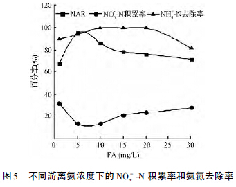 實(shí)驗(yàn)結(jié)果如圖5 所示,NAR隨著FA 的濃度增加先升高,在FA = 6.5 mg /L,NAR為97%,達(dá)到比較大值后又開始下降,但硝酸鹽積累率隨著FA 濃度的增加先減低后升高,說明高濃度FA 條件下,會(huì)抑制AOB 的活性,對NOB 的抑制效果不明顯,同時(shí),NOB 會(huì)逐漸適應(yīng)高濃度的FA。在FA = 10~20 mg /L 之間,氨氮去除率高達(dá)99%,NAR在此FA 濃度范圍內(nèi)是下降的,而NO3--N 積累率卻是上升的過程,由此可見,NOB 氧化了短程硝化產(chǎn)生的NO2-。因此高濃度FA 條件下造成NAR降低的原因有2 個(gè): 一是高濃度FA 會(huì)抑制AOB 的活性,減少NO2-的生成量; 一是NOB 活性未受抑制,利用NO2-為底物,將其氧化成NO3-。綜上所述,高濃度FA 會(huì)阻礙短程硝化的進(jìn)程,但是由于NOB 的活性未受抑制,仍然可以取得穩(wěn)定的NAR和較高的氨氮去除率。