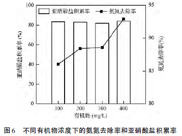 有機(jī)負(fù)荷越高,異養(yǎng)菌的活性越高,增值速率越快,生物合成作用利用的氨氮也越多,造成AOB 利用的底物與DO 減少,導(dǎo)致亞硝化速率降低。圖6 考察了包埋載體在不同有機(jī)物濃度下的處理效果,進(jìn)水氨氮濃度300 mg /L,停留時(shí)間12 h,用葡萄糖作為有機(jī)物的來源,葡萄糖的投加量根據(jù)有機(jī)物的濃度進(jìn)行配置。由圖可知,氨氮去除率隨著有機(jī)物濃度的增加而增加,在400 mg /L 時(shí)達(dá)到比較大值93.0%,在200~300 mg /L 時(shí)氨氮去除率維持在88.5%。氨氮去除率的升高可能是低濃度有機(jī)物的存在對AOB 的活性具有一定的促進(jìn)作用,提高了其氧化氨氮的能力。當(dāng)有機(jī)物濃度為100、200、300 和400 mg /L 時(shí),NAR分別為83.3%、83.0%、81.8% 和83.8%。可見低濃度的有機(jī)物并未對AOB 的活性產(chǎn)生明顯的抑制,包埋載體的亞硝化速率并未降低,短程硝化效果良好。因此,低濃度有機(jī)物可以提高包埋載體的氨氮去除率,對短程硝化的抑制作用不明顯,同時(shí)包埋載體為AOB 的活性起到很好的保護(hù)作用,能夠抵御有機(jī)負(fù)荷的變化。