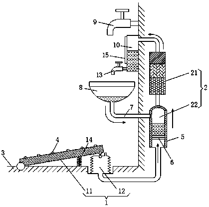 二,根據(jù)權(quán)利要求1所述的一種生活污水循環(huán)利用節(jié)水系統(tǒng),其特征在于:所述踏板(11)的下表面中部還裝置有彈性復(fù)位裝置(14),所述彈性復(fù)位裝置(14)的兩端分別固定于踏板(11)的下部和地板(3)的表面。